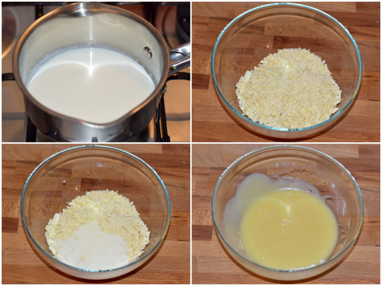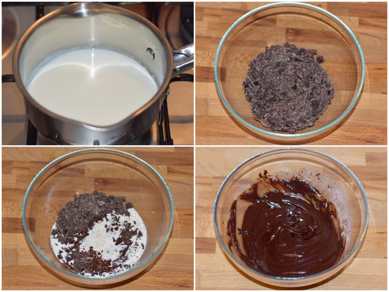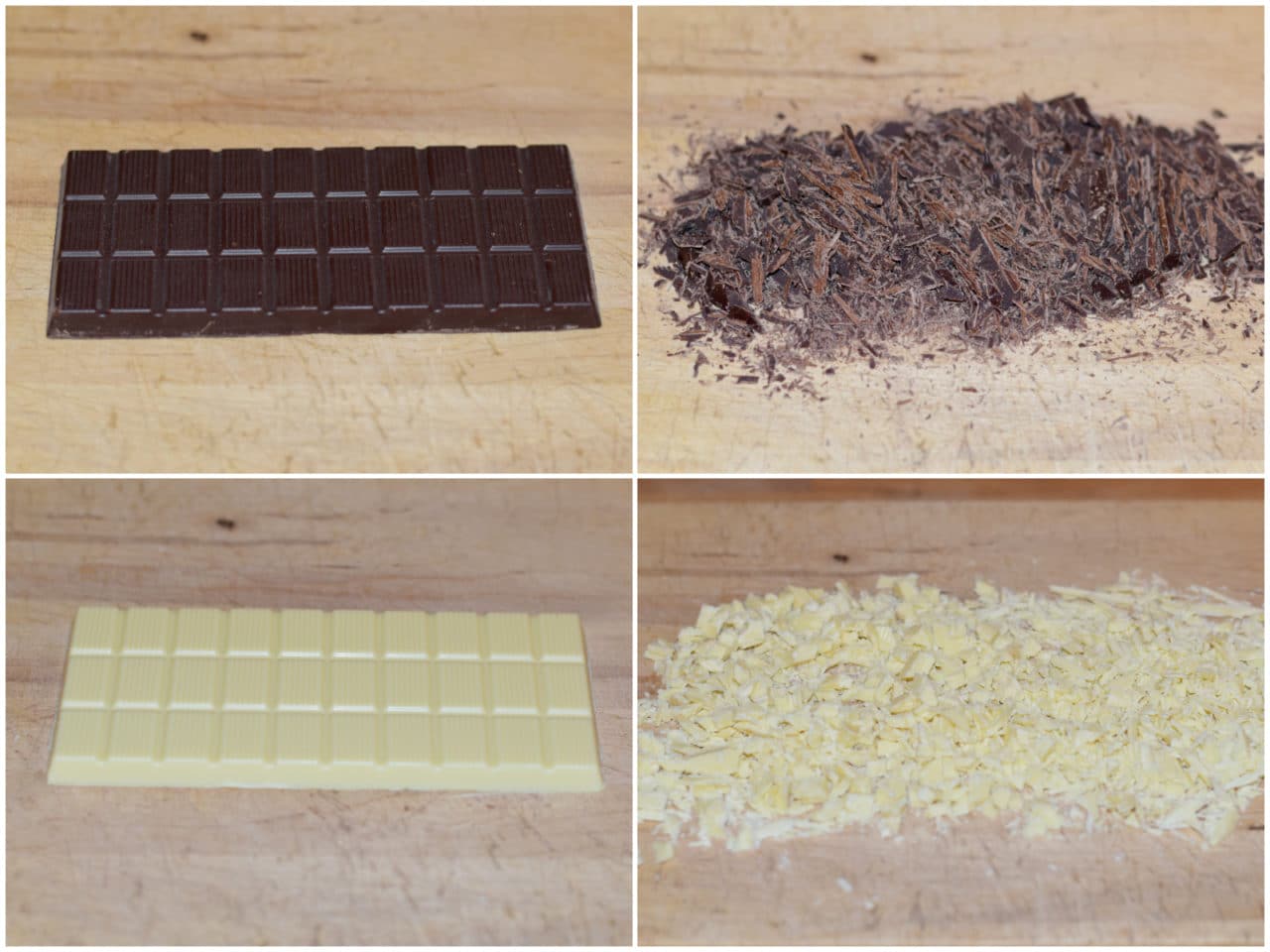 Preparate le 2 ganache: tritate, separatamente, i due tipi di cioccolato; a parte, scaldate la panna quasi fino all'ebollizione, quindi versatene metà sul cioccolato fondente e metà sul cioccolato bianco.