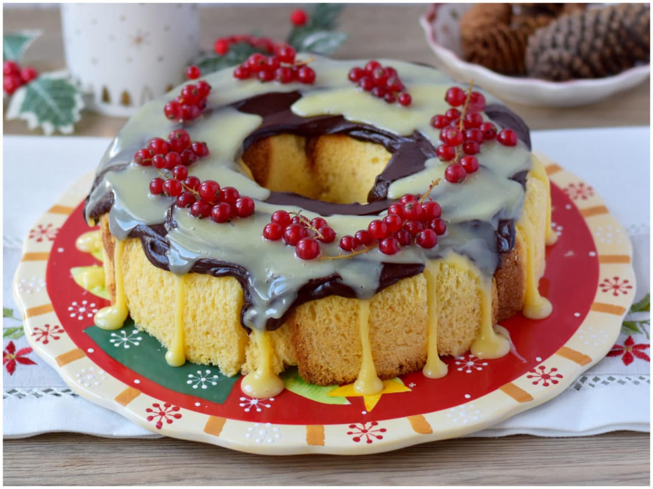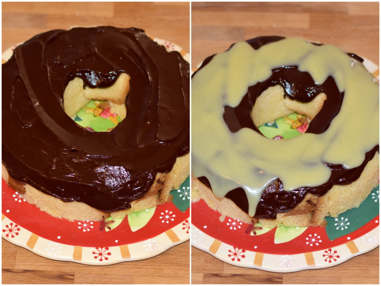 Decorate la ciambella facendoci colare sopra prima il cioccolato fondente e poi quello bianco.