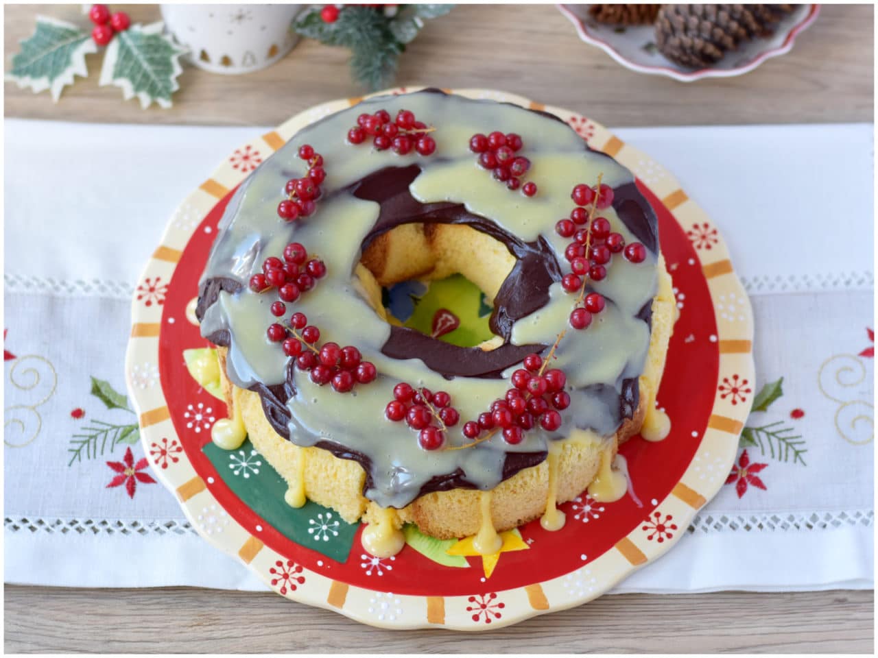 La ciambella di pandoro è pronta, non vi resta che decorarla a piacere con il ribes e servirla.