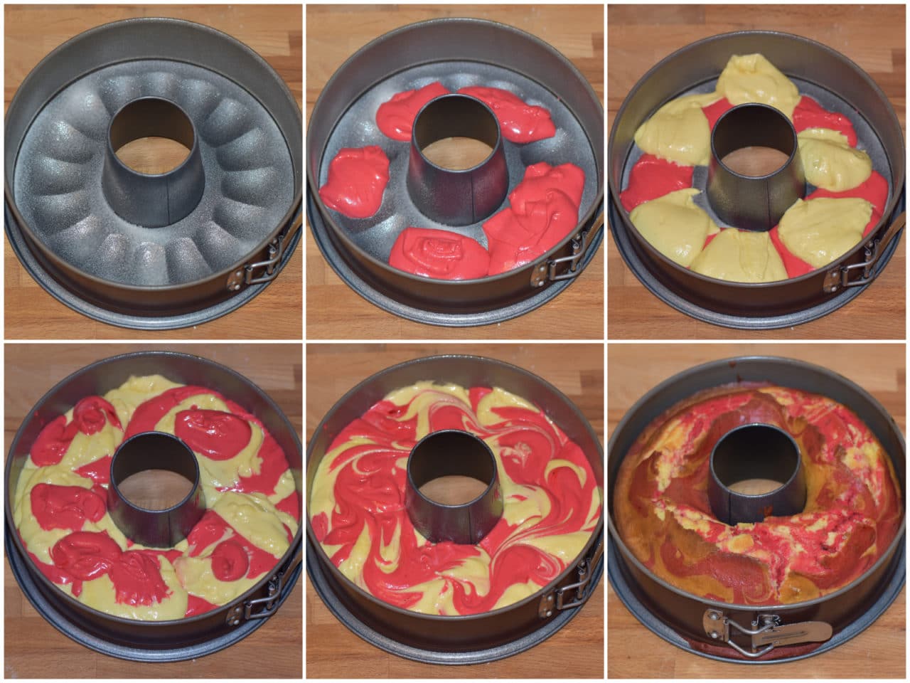 Versate il composto a cucchiaiate nello stampo imburrato e infarinato, alternando pastella rossa e pastella normale, quindi mescolate leggermente con uno stuzzicadenti per ottenere l'effetto marmorizzato.