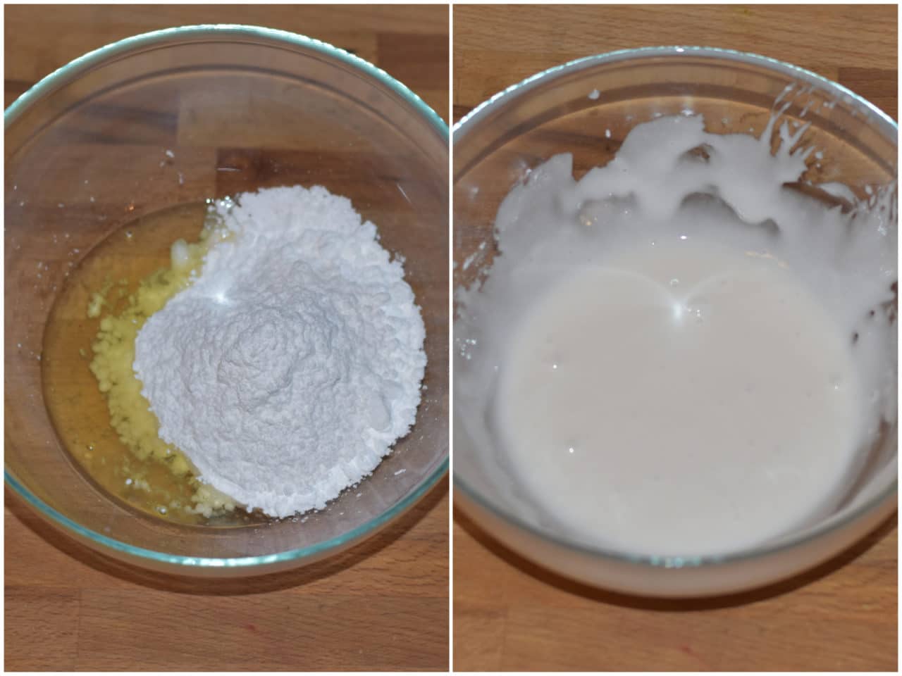 Preparate la glassa unendo in una ciotola albume, zucchero a velo e succo di limone e mescolando fino ad ottenere un composto fluido e omogeneo.