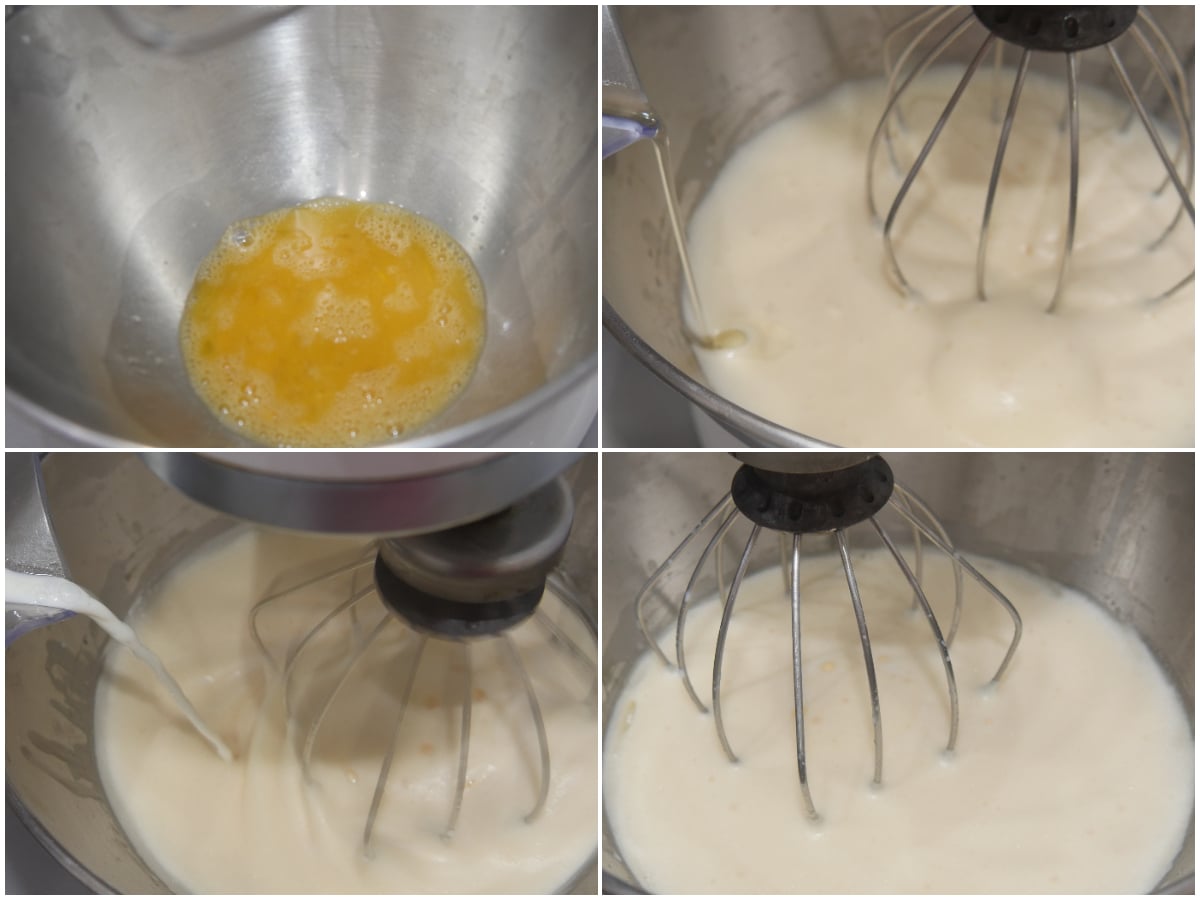 Incorporate farina e lievito setacciati, poi aggiungete anche parmigiano, pancetta, scamorza a cubetti e funghi e amalgamate.