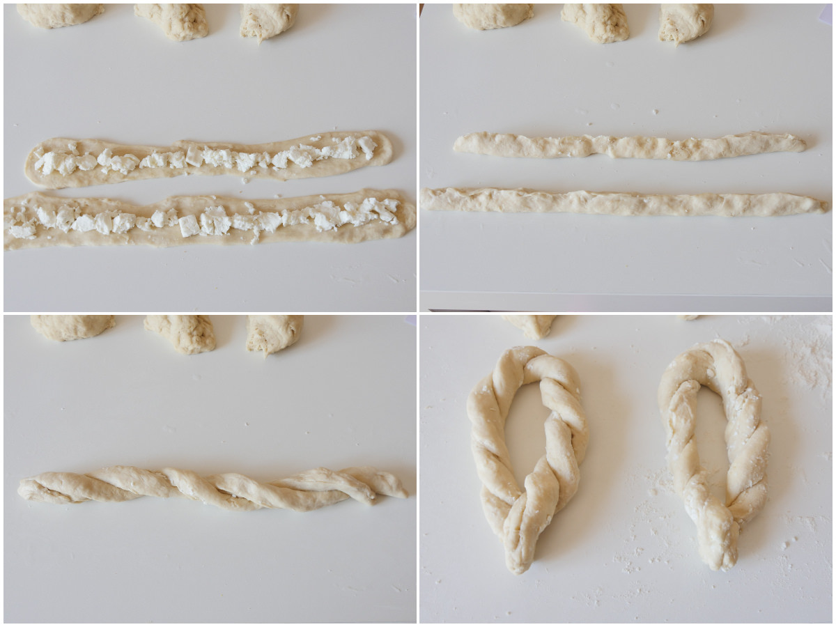 Mettete della feta sbriciolata al centro di ogni cordoncino schiacciato e chiudete l'impasto intorno al formaggio.