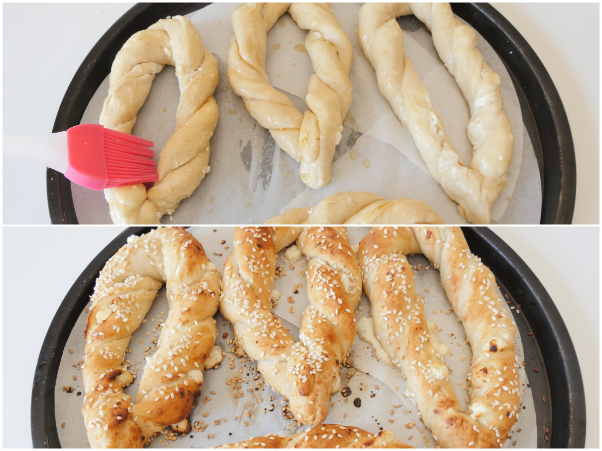 Le ciambelle con feta sono una ricetta greca simile a quelle delle simit turche. Anche in questo caso, infatti, si tratta di ciambelle al sesamo, solo che in questo caso sono ciambelle al sesamo ripiene di feta... Una vera e propria delizia, non vi pare? La ricetta rimane facile e abbastanza rapida (anche qui, se preferite la versioen lievitata, potete usare 1/4 di cubetto di lievito di birra e far lievitare l'impasto per un paio d'ore), e il risultato, se come me amate questo saporito formaggio greco, è decisamente da provare!