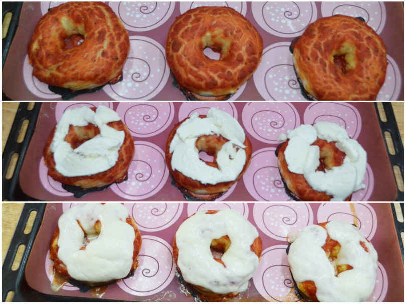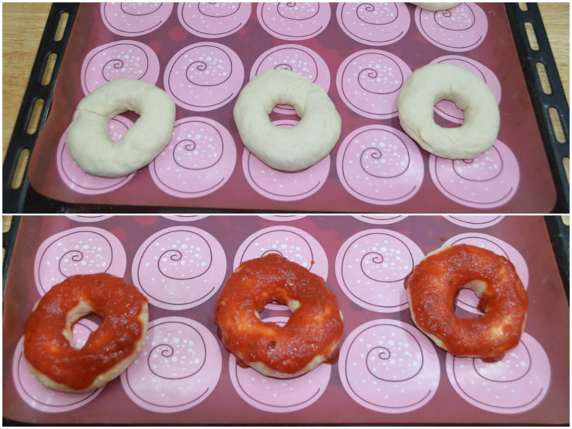 man mano che sono pronte, disponete le ciambelle su una teglia rivestita di carta forno e conditele con il pomodoro.