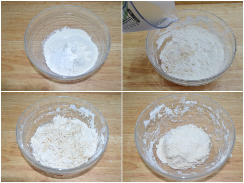 Preparate quindi l'impasto: mettete la farina a fontana in una ciotola, aggiungete sale e lievito, quindi iniziate ad aggiungere l'acqua a filo, impastando man mano con le mani.
