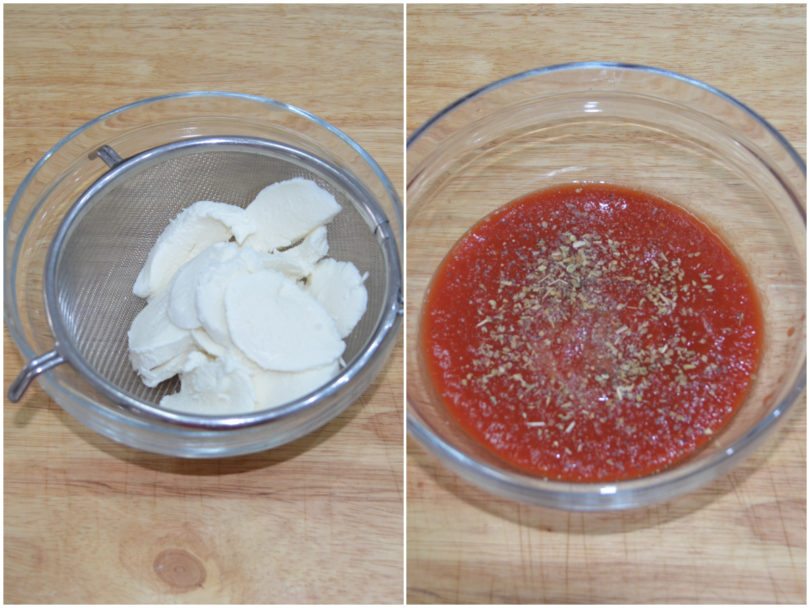 Innanzitutto tagliate a fettine la mozzarella e mettetela a scolare in un colino.