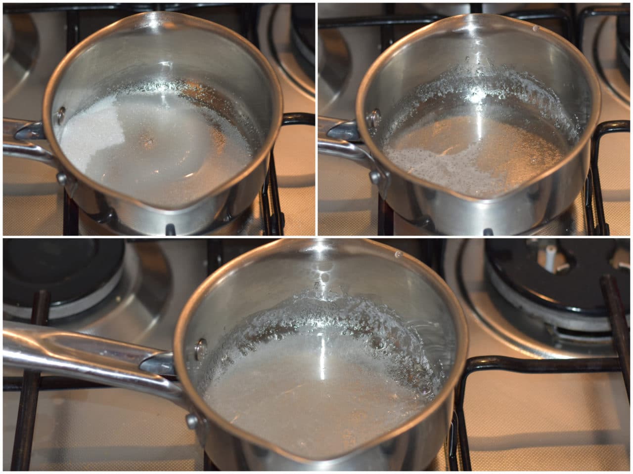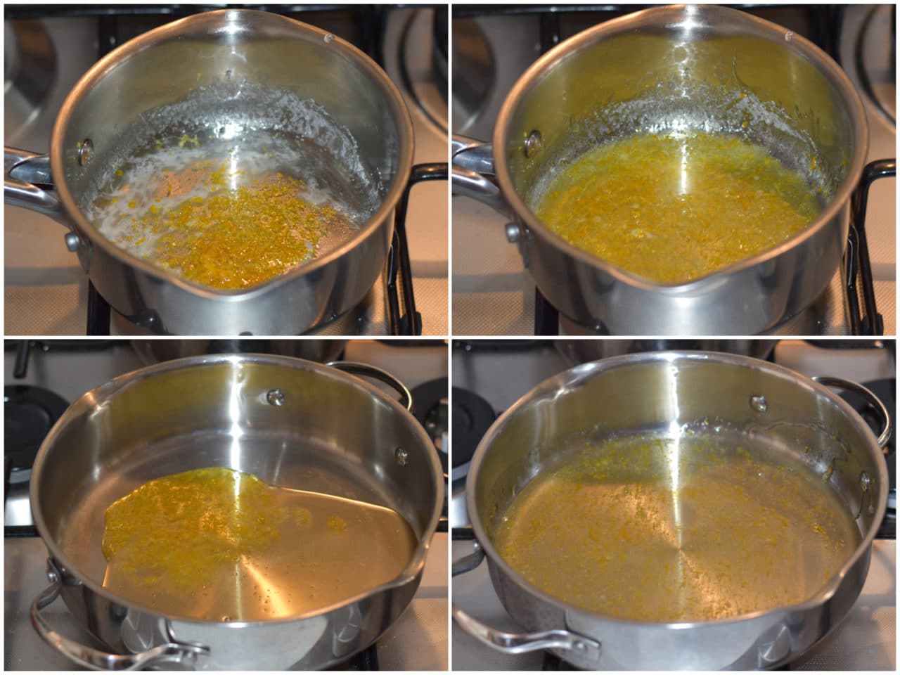 Mettete in una pentola acqua e zucchero, portate a ebollizione e lasciate addensare leggermente, quindi unite le bucce grattugiate degli agrumi e il miele e mescolate.