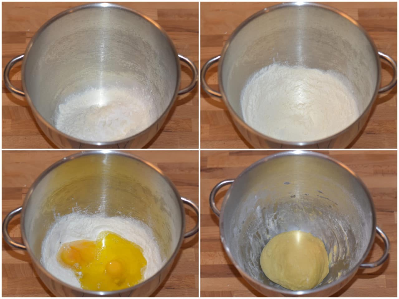 Innanzitutto preparate l'impasto: mettete in una ciotola farina, uova, zucchero olio, liquore e sale e lavorate per almeno 10 minuti, finché non avrete ottenuto un impasto liscio, elastico ed omogeneo, quindi avvolgetelo con pellicola per alimenti e lasciatelo riposare per 30 minuti.