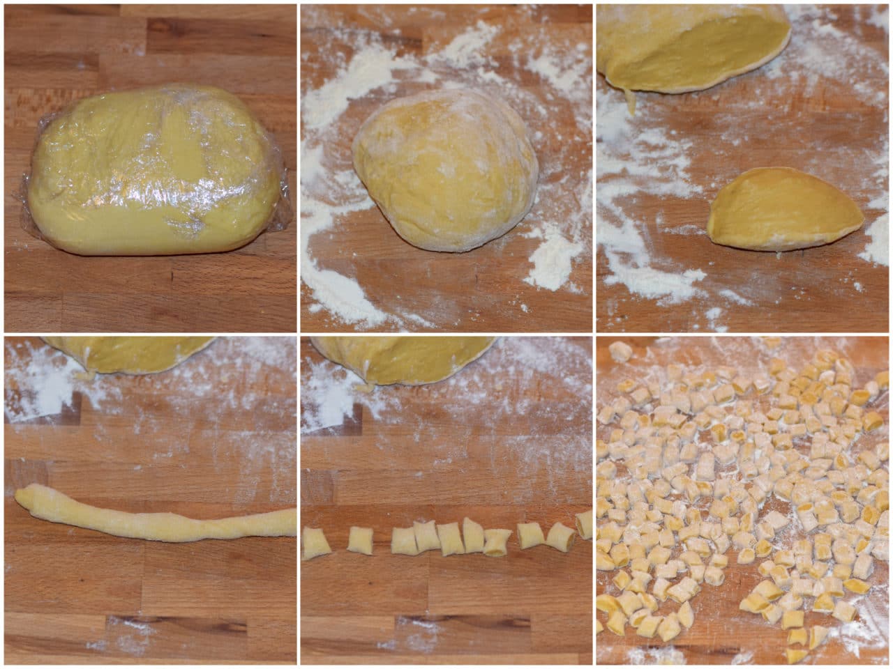 Riprendete il panetto, eliminate la pellicola, prendete un pezzo di impasto per volta, ricavate un cordoncino lungo e sottile (1-1,5 cm) e tagliatelo a tocchetti circa della stessa lunghezza dello spessore.