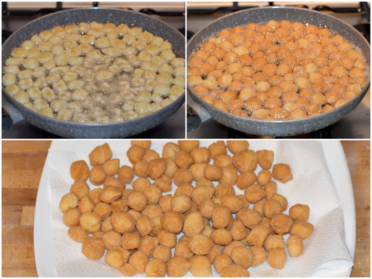 Una volta che avrete tagliato tutto l'impasto, fate scaldare olio abbondante in una padella ampia e friggete fino a doratura, scolandoli poi con una schiumarola su carta da cucina: lasciate raffreddare.