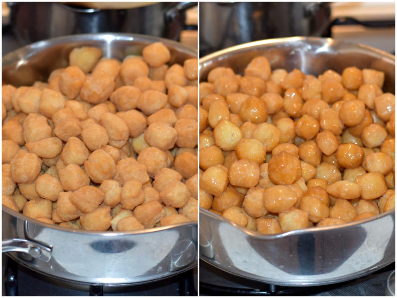 Versate i tocchetti di impasto fritti nello sciroppo e mescolate fino a farlo distribuire in maniera uniforme.