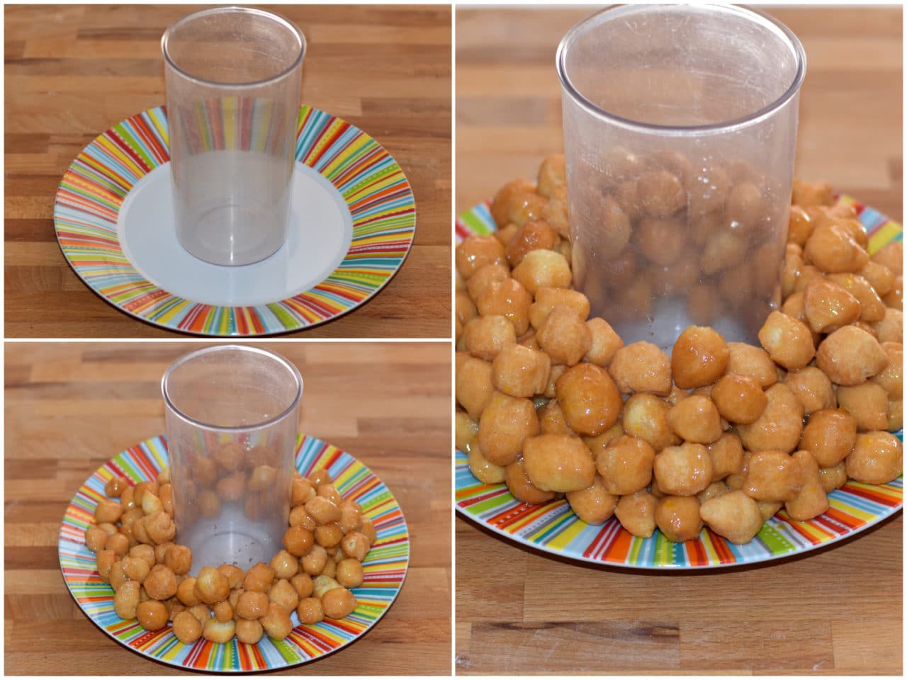 Assemblate la cicerchiata: mettete un contenitore lungo e stretto (circa 8-10 cm), leggermente unto di olio, al centro del piatto da portata e posizionateci intorno i tocchetti glassati (in questo modo prenderanno la forma a ciambella).