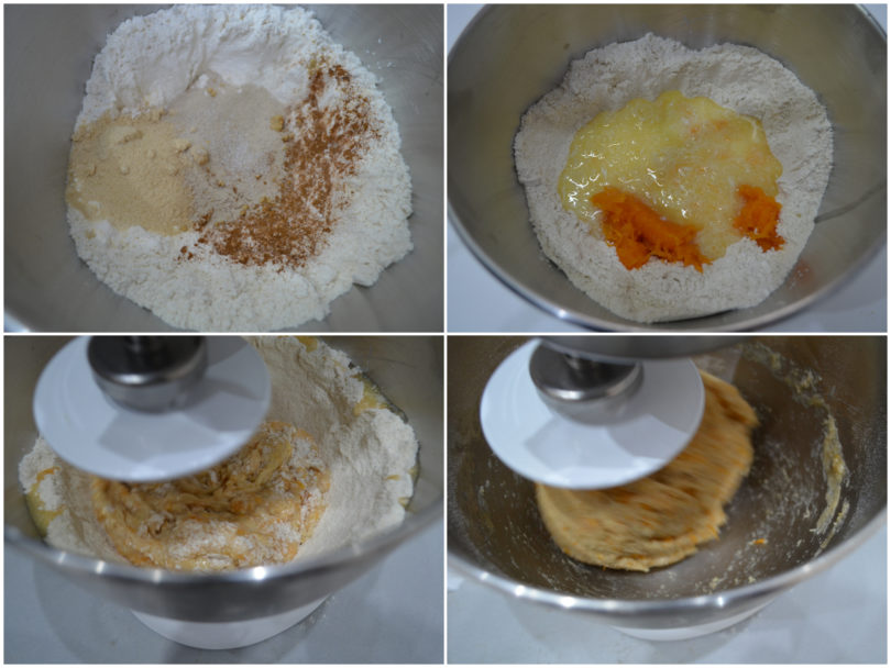 Mettete nella ciotola della planetaria farina, zucchero, aromi (zenzero, cannella e noce moscata) e lievito.