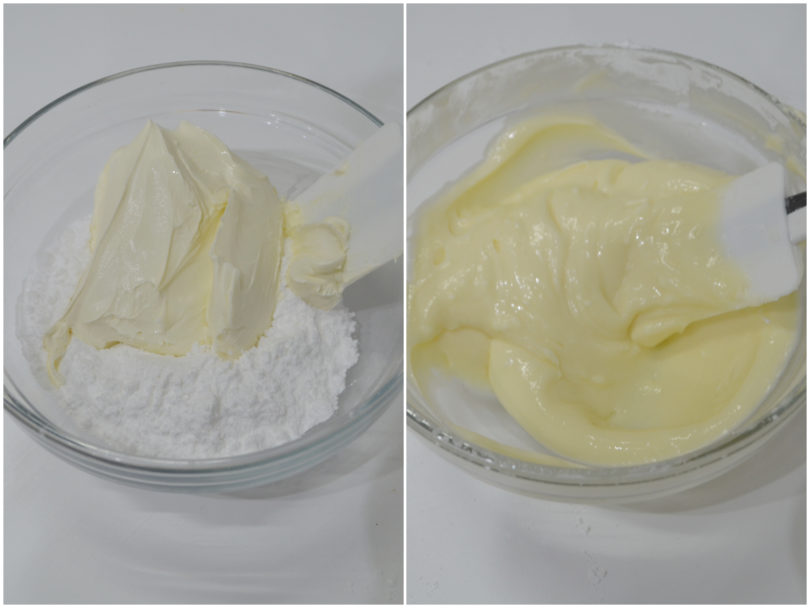 Nel frattempo, preparate la glassa, lavorando insieme in una ciotola il formaggio spalmabile con il latte e lo zucchero a velo.