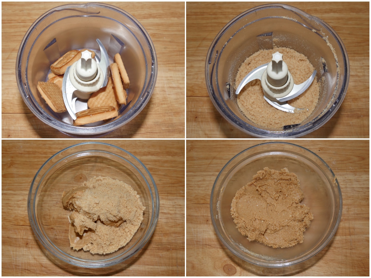 Tritate finemente i biscotti, quindi incorporateci il burro di arachidi: dovrete ottenere un composto lavorabile.