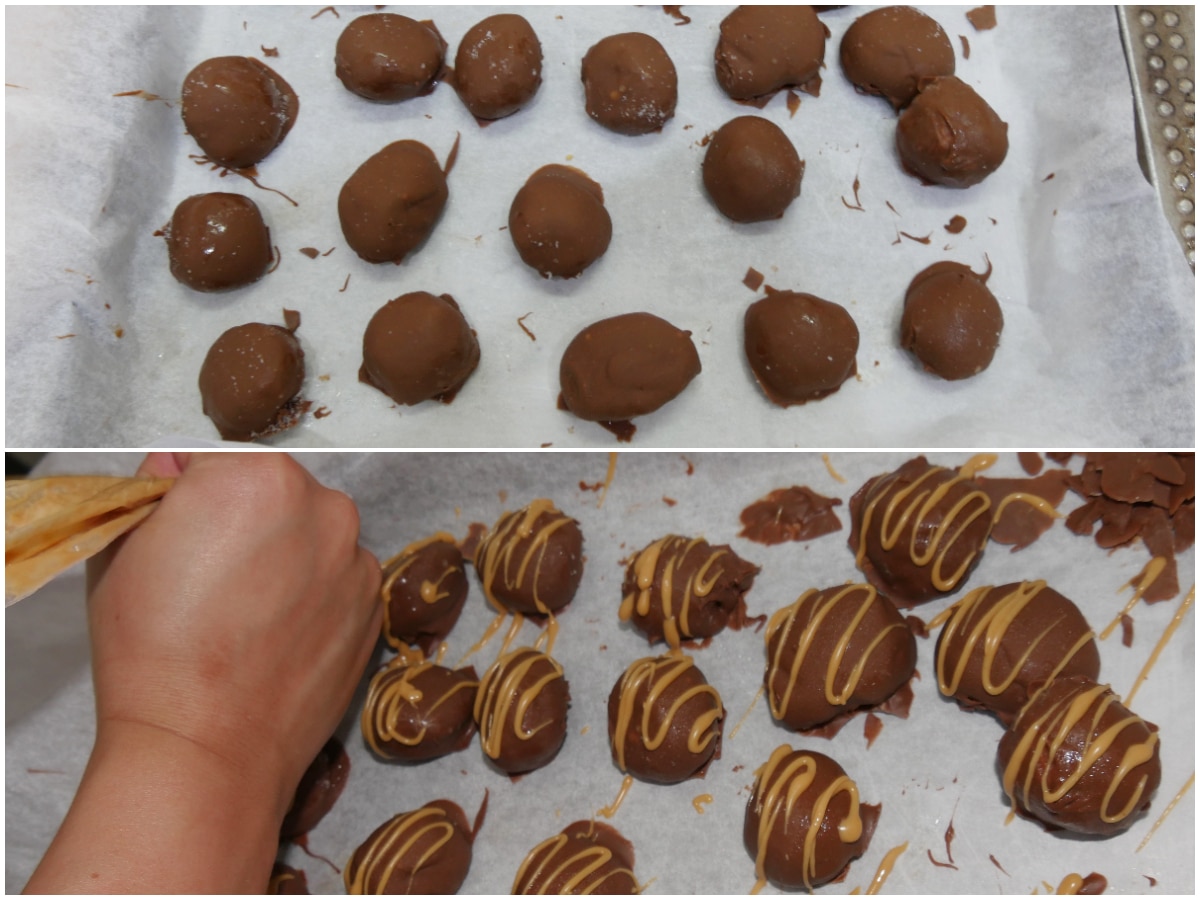 Decora i tartufini a piacere con il burro di arachidi (io l'ho messo in una sac-à-poche per creare dei decori sottili).
