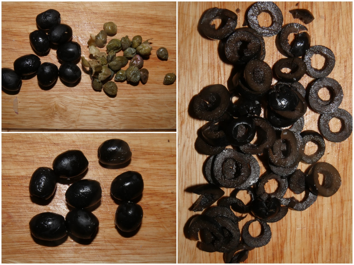 Dissalate i capperi e denocciolate le olive, quindi tagliate queste ultime a rondelle (o comunque spezzettatele).
