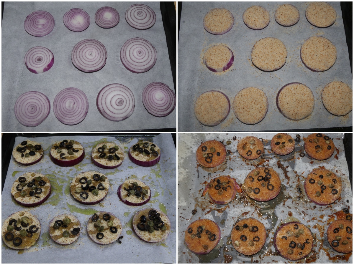 Disponete le fette di cipolla sulla teglia rivestita di carta forno e condite con pangrattato, olive, capperi, pochissimo sale, pepe e un filo d'olio.