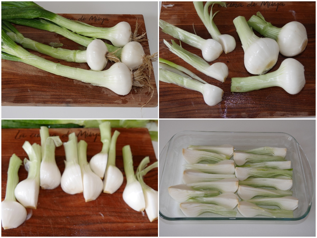Lavate bene i cipollotti, mondateli delle radici ed eliminate la parte più verde delle foglie, quindi tagliateli a metà e poi di nuovo a metà.