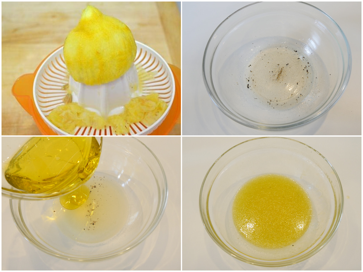 Mettete in una ciotolina sale, pepe e succo di limone e mescolate fino a far sciogliere il sale.