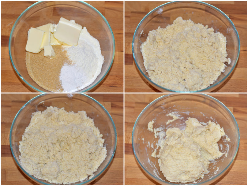 Innanzitutto preparate l'impasto: Unite zucchero, farina, lievito setacciato e burro a tocchetti in una ciotola e lavorate fino ad ottenere un composto sbricioloso, quindi aggiungete l'acqua e lavorate fino ad ottenere un impasto omogeneo.