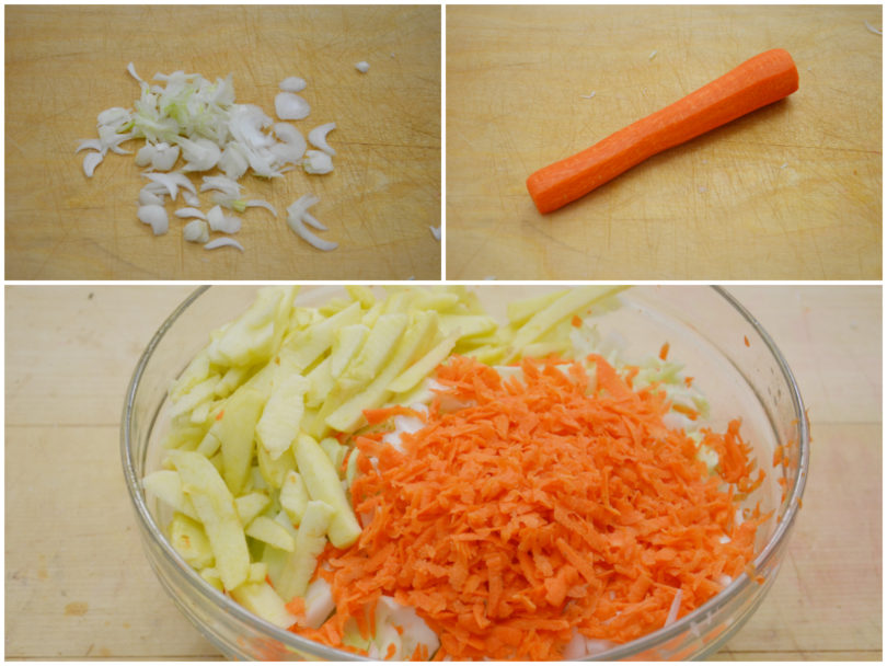 Poi sbucciate la carota e grattugiatela a fori larghi aggiungendola direttamente nella ciotola con il cavolo. Tagliate anche la cipolla in maniera sottile e aggiungete anch’essa nella ciotola.