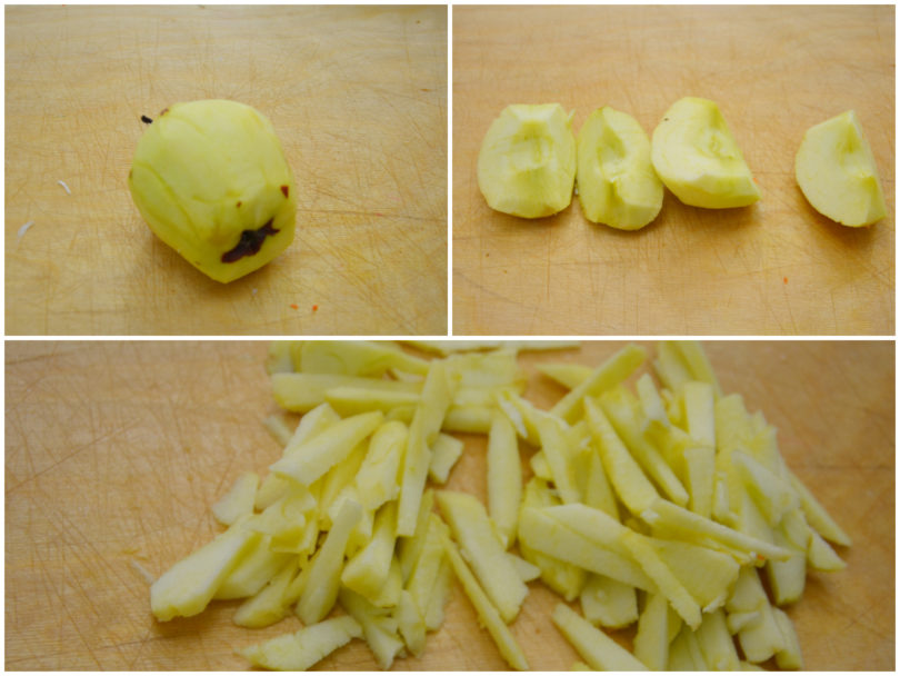 Sbucciate la mela, eliminate il torsolo e tagliatela alla julienne. Aggiungete in ultimo anch’essa nella ciotola e mescolate bene il tutto.