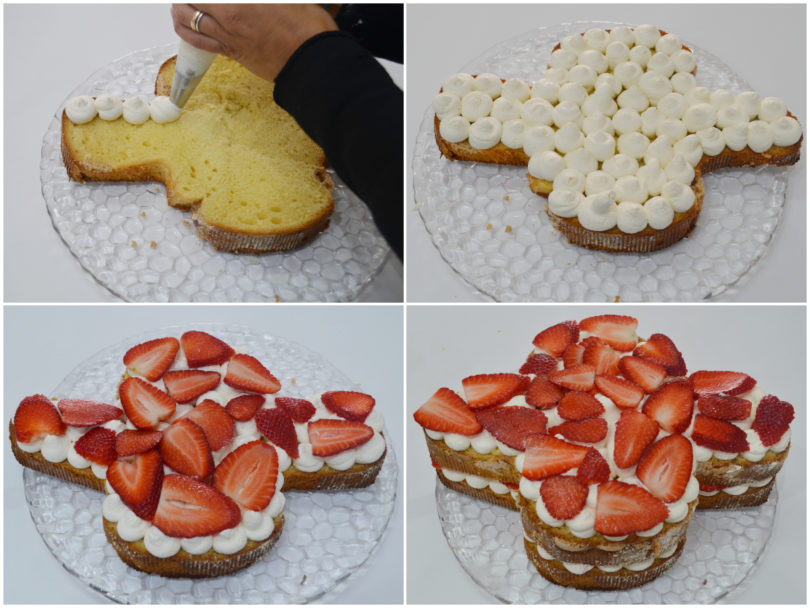 Aggiungete uno strato di fragole, quindi procedete con il secondo strato di colomba, crema e fragole.
