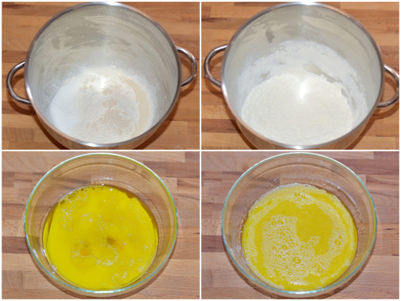 Mescolate farina, zucchero e lievito in una ciotola; a parte, unite in un'altra ciotola latte caldo, acqua, uova, olio e sale e sbattete con una forchetta.