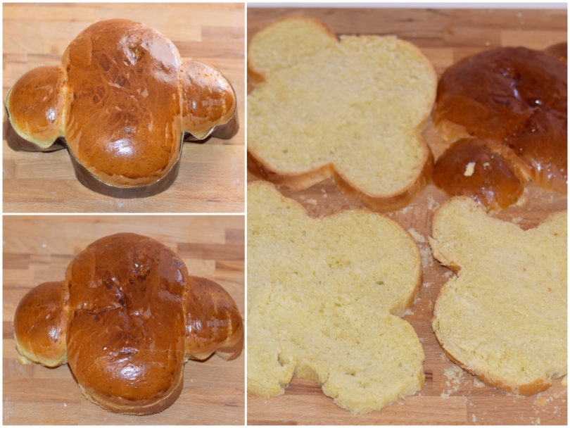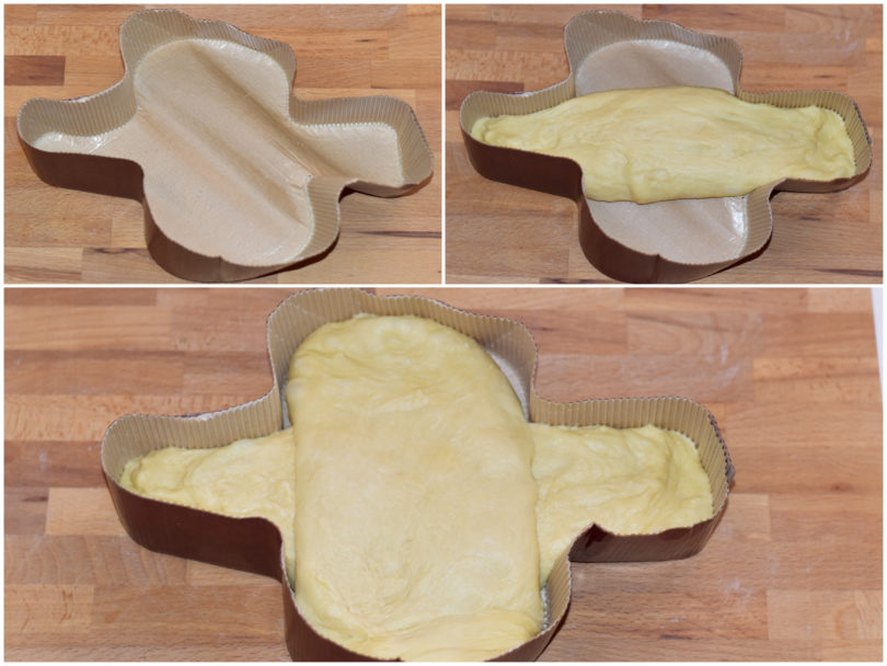 Quando sarà raddoppiato di volume dividete l'impasto a metà, date a ognuno dei due pezzi una forma allungata e disponeteli a X nello stampo, mettendo prima la forma lunga, per il corpo, e poi trasversalmente quella per le ali.