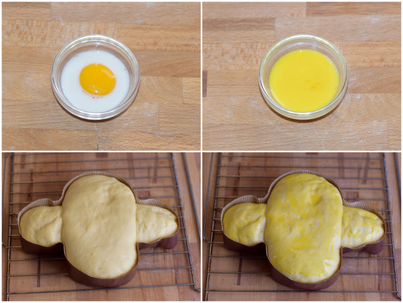 Lasciate lievitare per almeno altri 30 minuti (o fino al raddoppio) in luogo caldo, poi spennellate con il tuorlo sbattuto con un po' di latte, quindi cuocete per circa 35 minuti o fino a doratura in forno statico preriscaldato a 180°C.