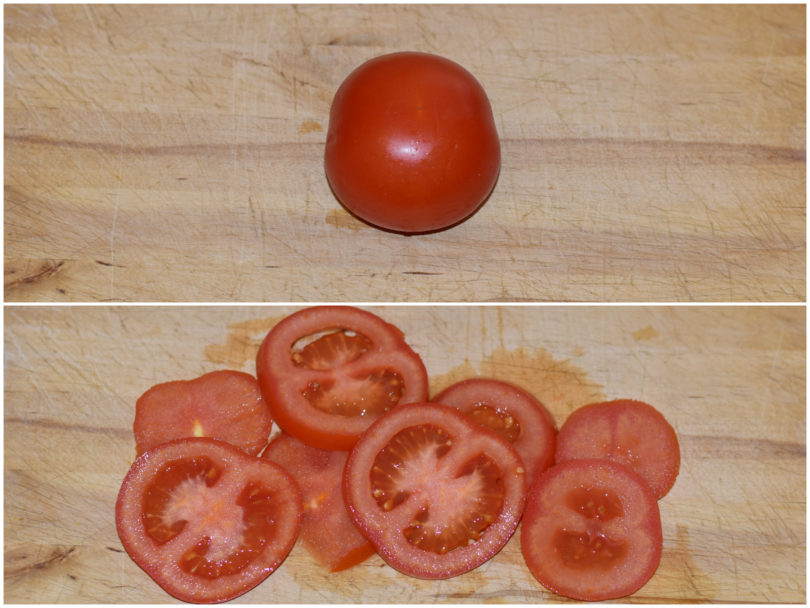 Preparate gli ingredienti per la farcitura: mondate e tagliate a fette i pomodori, lavate e scolate bene la rucola, sgocciolate i carciofini.