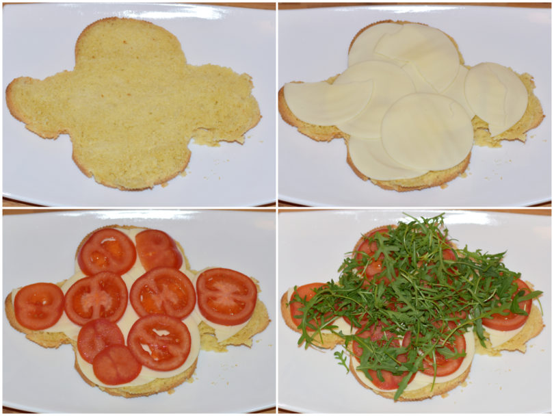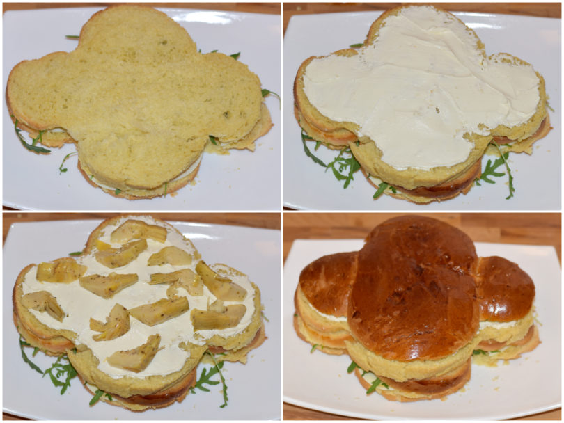 Farcite quindi il primo strato con scamorza, pomodori e rucola; coprite con il secondo strato lasciandolo senza farcitura (in questo modo potrete ottenere dei sandwich, più facili e comodi da mangiare); aggiungete il terzo strato e farcite con formaggio spalmabile e carciofini, poi completate con l'ultimo strato.