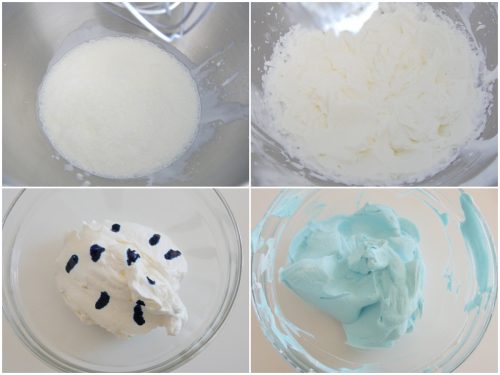 Montate la panna, ben fredda di frigo, quindi aggiungete qualche goccino di colorante alimentare azzurro e amalgamate delicatamente, in modo da non farla smontare.