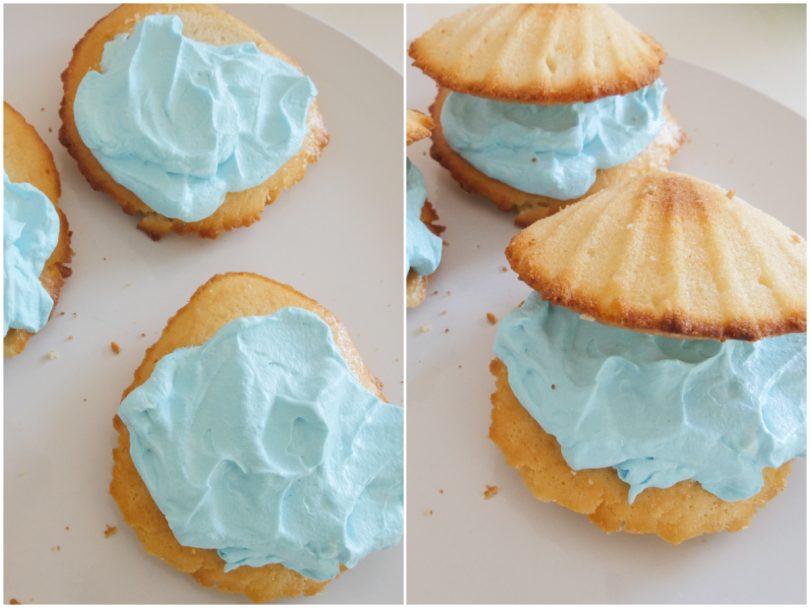 Assemblate i dolcetti, unendo le conchiglie a 2 a 2 con un po' di panna al centro, lasciando la conchiglia superiore un po' scostata, in modo da far vedere bene il ripieno (se avete difficoltà, unite le conchiglie con uno stuzzicadenti).