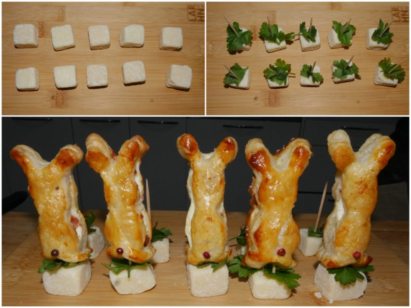 Assemblate: preparate dei cubotti di grana o parmigiano, aggiungete su ognuno una fogliolina di prezzemolo fresco e infilzate con la punta di uno stuzzicadenti, quindi infilate i coniglietti sugli stuzzicadenti.