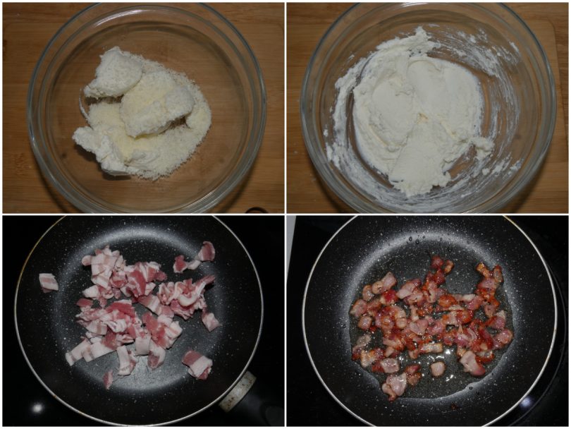Preparate la farcitura: farte rosolare la pancetta a dadini in padella antiaderente fino a renderla croccante.