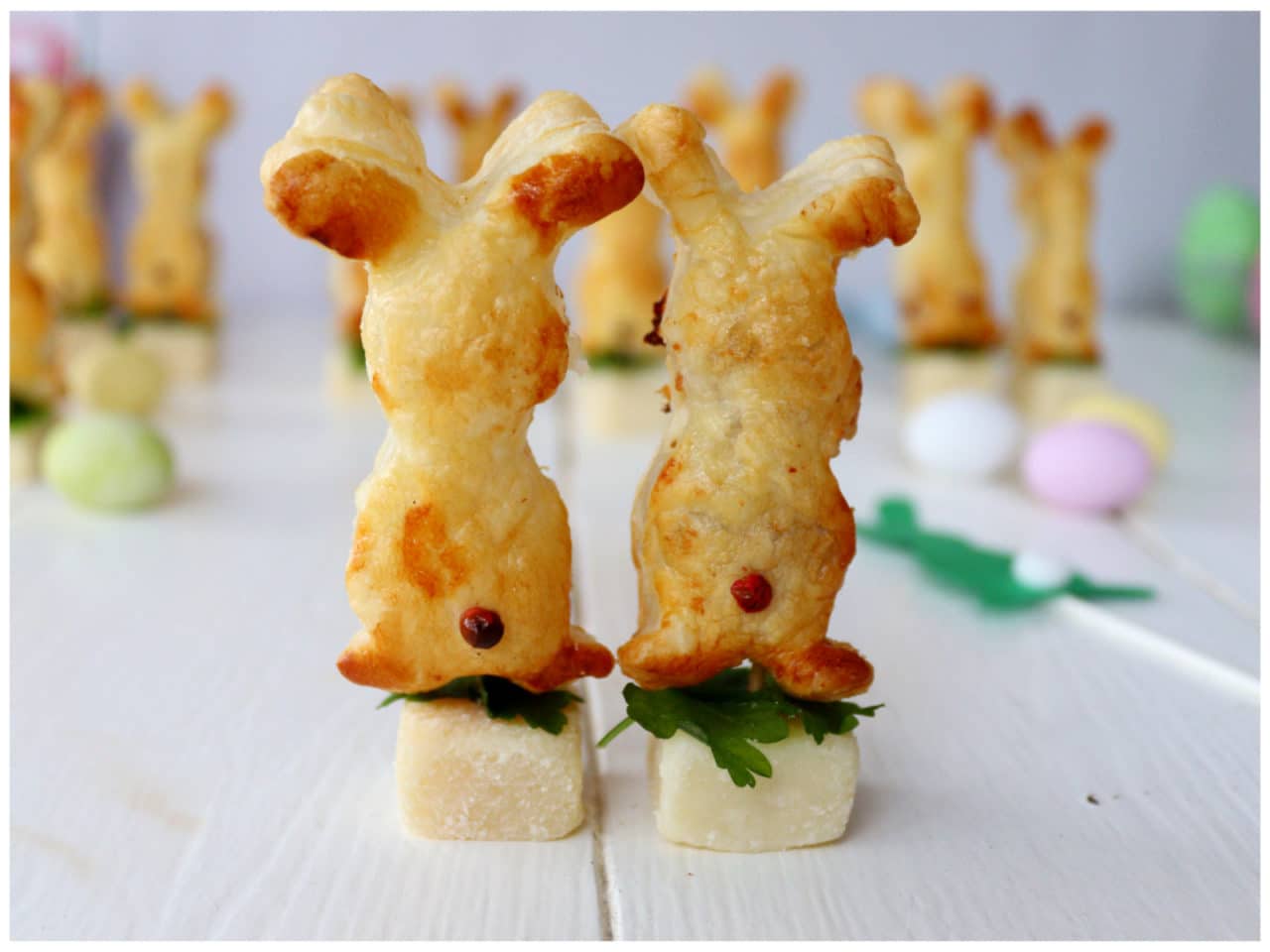 I coniglietti di pasta sfoglia sono un'idea simpatica per un aperitivo o antipasto da servire nel periodo pasquale. Carini e saporiti, sono anche semplici da fare e potete persino sfruttarli come segnaposto, secondo me. Io li ho farciti con ricotta e pancetta, ma potenzialmente potete usare quello che preferite, da besciamella con piselli a hummus e rucola. Basta che la farcia sia abbastanza densa, in modo che non fuoriesca in cottura ;) L'idea di servirli sul cubetto di grana e prezzemolo l'ho presa da un pizzico di pepe rosa e così sono diventati ancora più graziosi :D