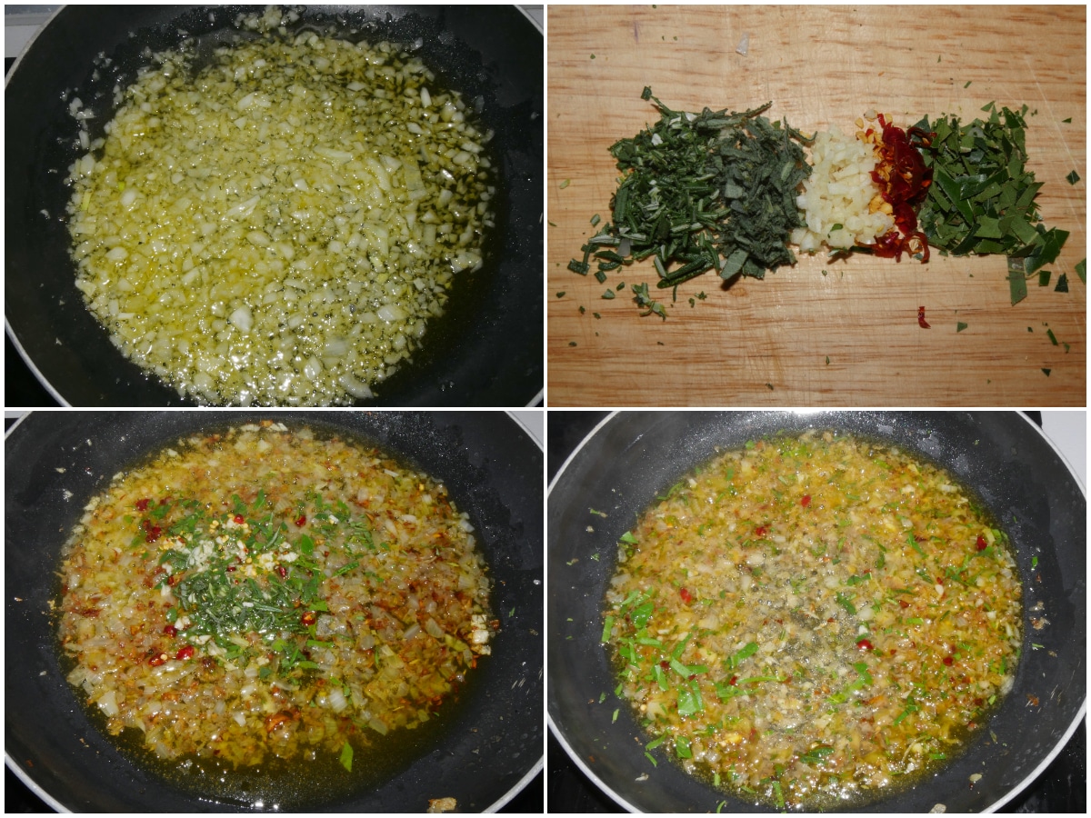 Nel frattempo tritate anche aglio, peperoncino, salvia e rosmarino, uniteli alla cipolla e lasciate insaporire e appassire tutto insieme.