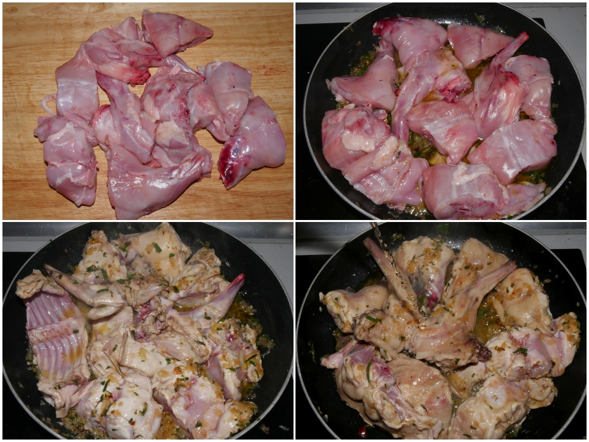 Aggiungete anche il coniglio in pezzi e lasciatelo dorare da entrambi i lati, poi sfumate con il vino.