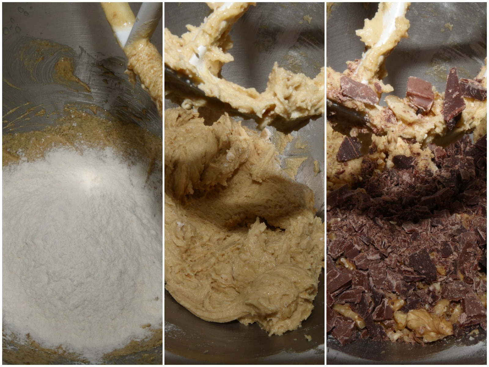Unite la farina, il lievito e la vanillina ed incorporateli al composto. Poi aggiungete noci e cioccolato.