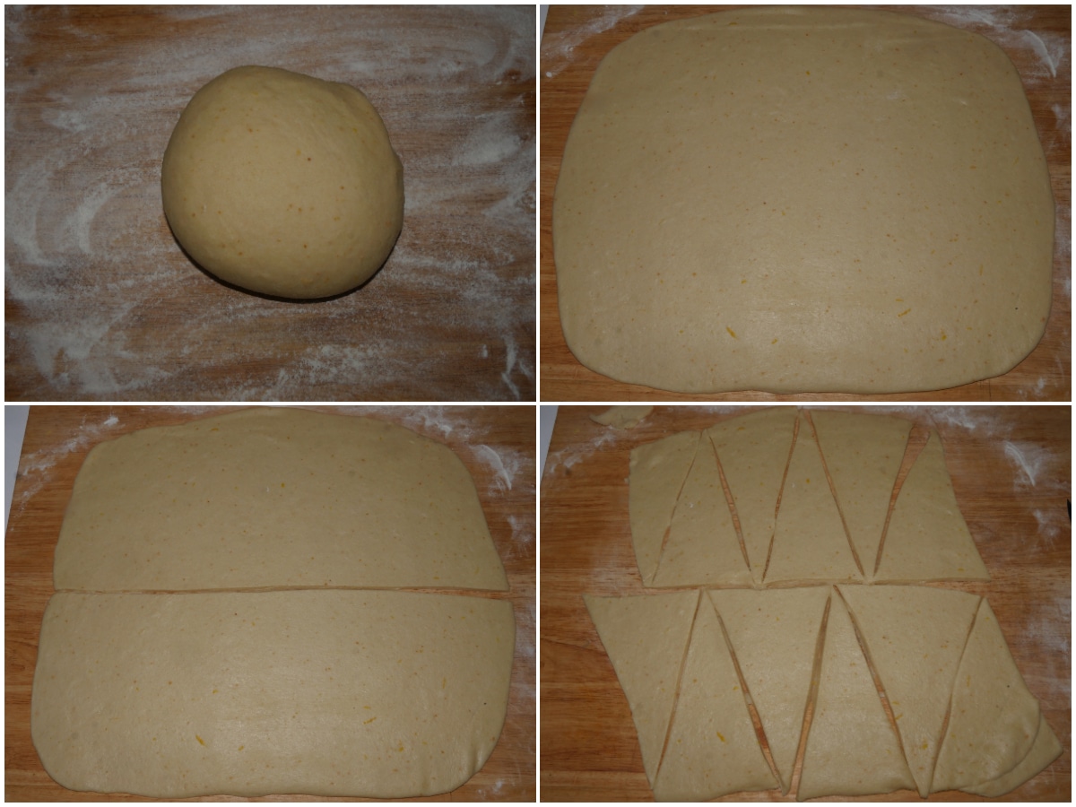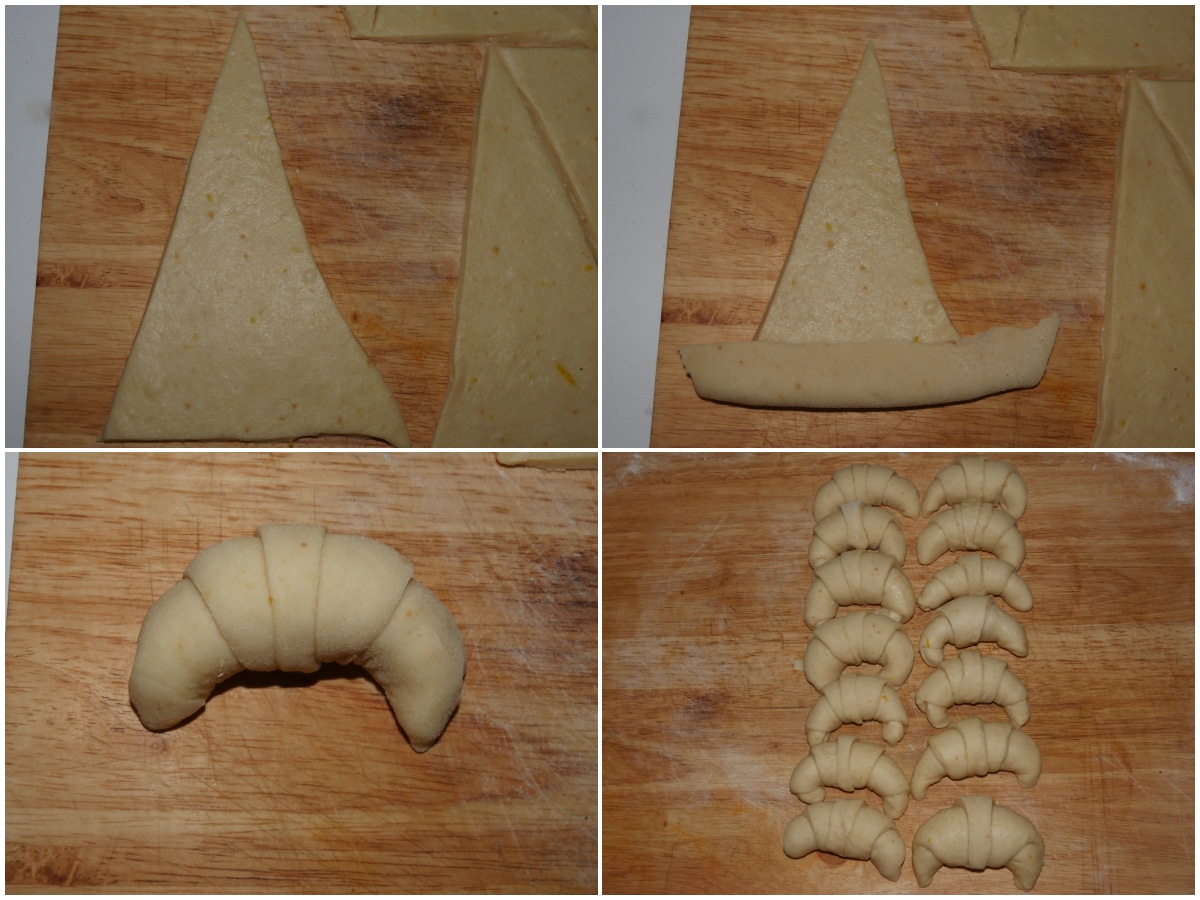 Formate i cornetti, semplicemente arrotolando ogni triangolino partendo dal lato corto e arrivando man mano fino alla punta.
