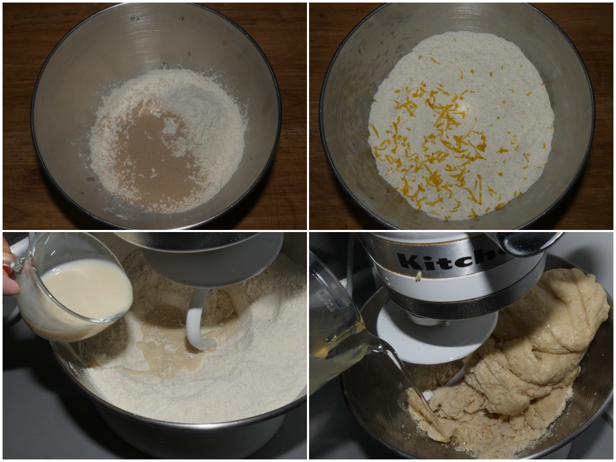Mettete in una ciotola farina e lievito e mescolate, quindi aggiungete anche zucchero e bucce di agrumi e mescolate ancora.
