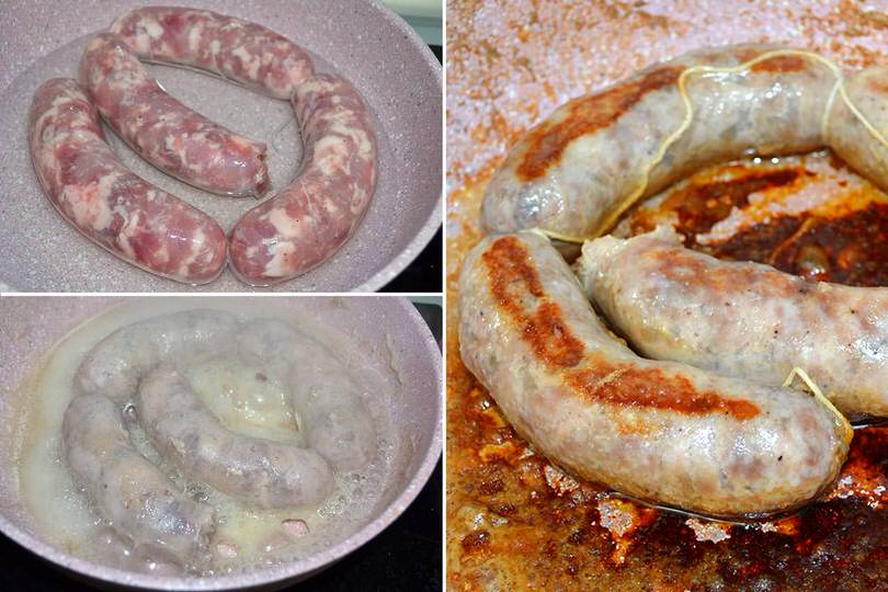 Nel frattempo cuocete le salsicce in un'altra padella con l'aggiunta di un bicchiere d'acqua