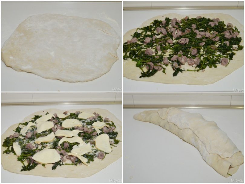 Adagiate il cornettone salsiccia e friarielli sulla placca da forno imburrata e mettete in forno già caldo a 220 gradi