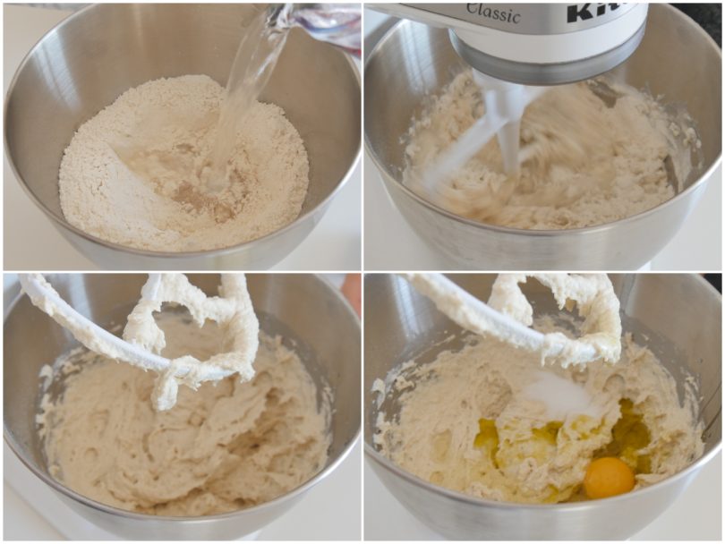 Mettete in un'ampia ciotola 500 gr di farina,aggiungere man mano l'acqua con all'interno disciolto il lievito. Lavorate l'impasto con la foglia per 5 minuti, poi aggiungete l'uovo, l'olio ed il sale e continuare a montare per una decina di minuti