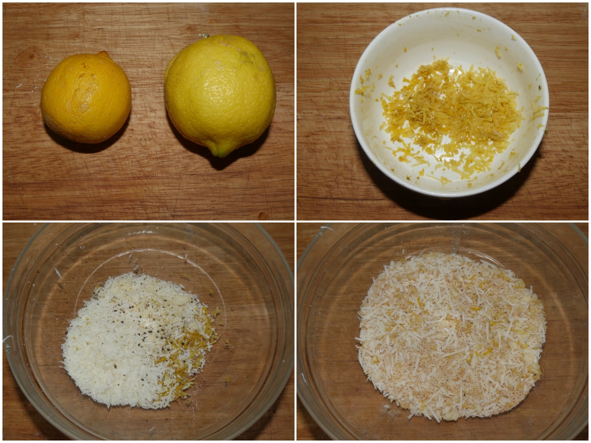 Innanzitutto preparate la panatura unendo in una ciotola pangrattato, parmigiano, pecorino, buccia di limone e pepe.