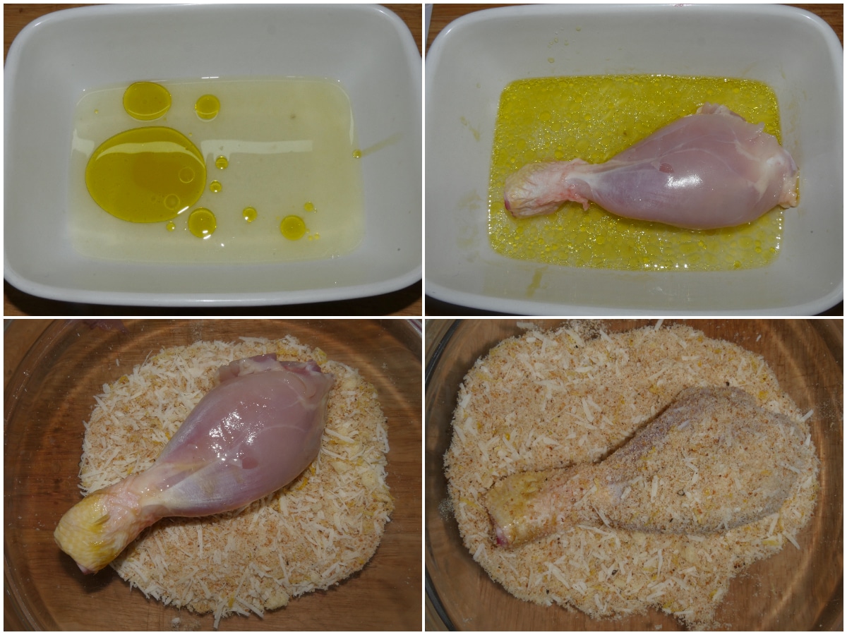 Preparate un'emulsione con olio, succo di limone e sale, bagnateci dentro le coscette e poi passatele nella panatura, cercando di distribuirla in maniera uniforme.