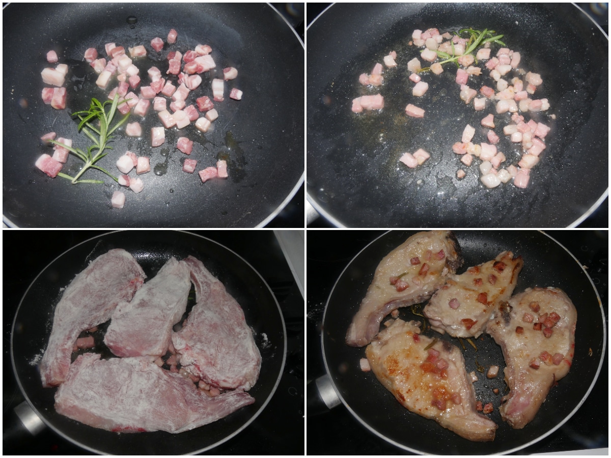 Fate soffriggere la pancetta con burro e rosmarino; quando la pancetta sarà dorata, aggiungete la carne e fatela rosolare da entrambi i lati.